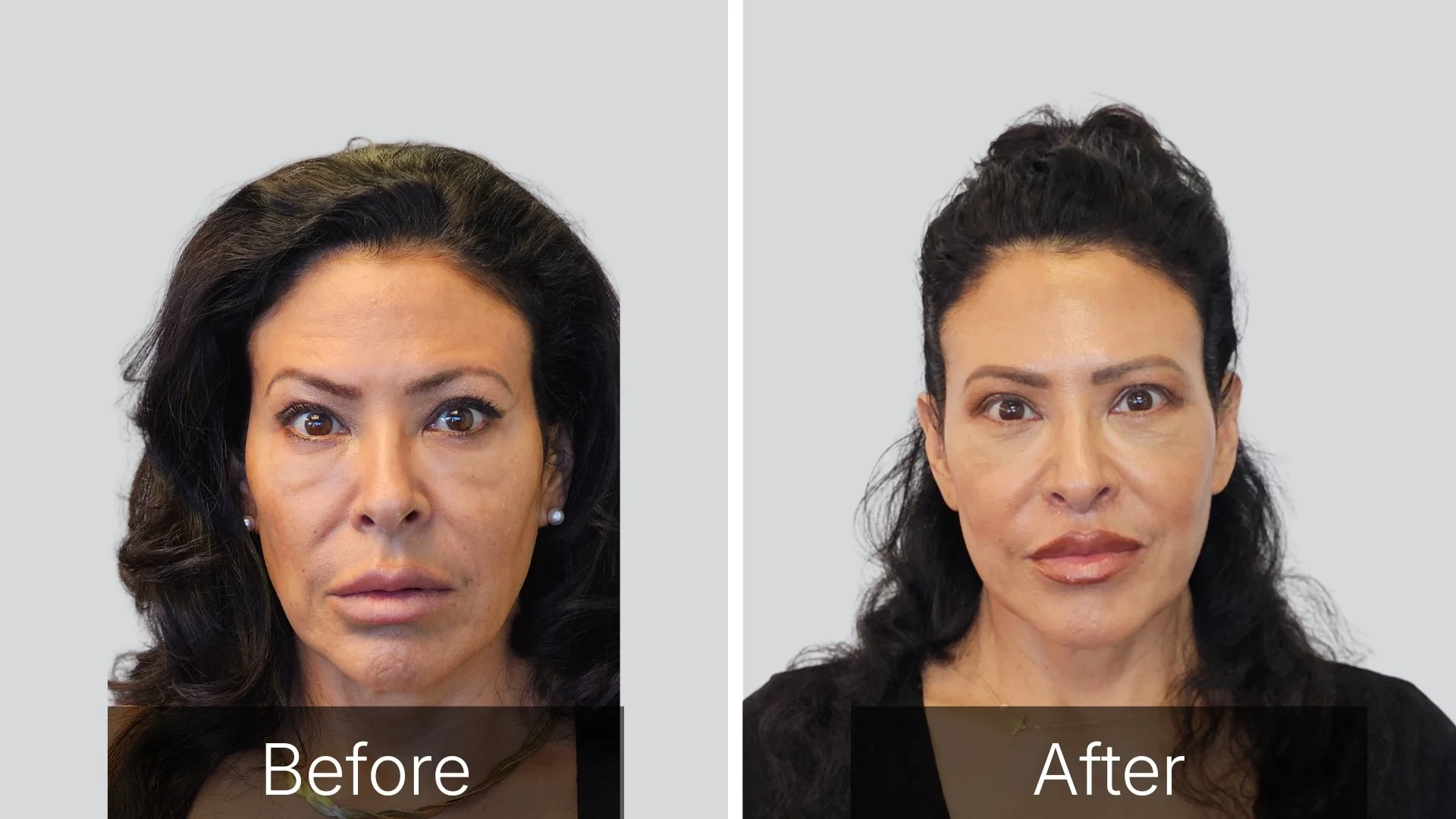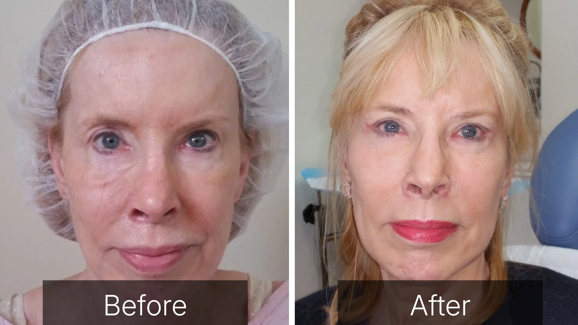 Before picture is patient years after having had a facelift, forehead lift, and two eye procedures. She was referred to Bright Eyes MD by Maurice Sherman, MD, double board certified ENT/Facial Plastic Surgeon.